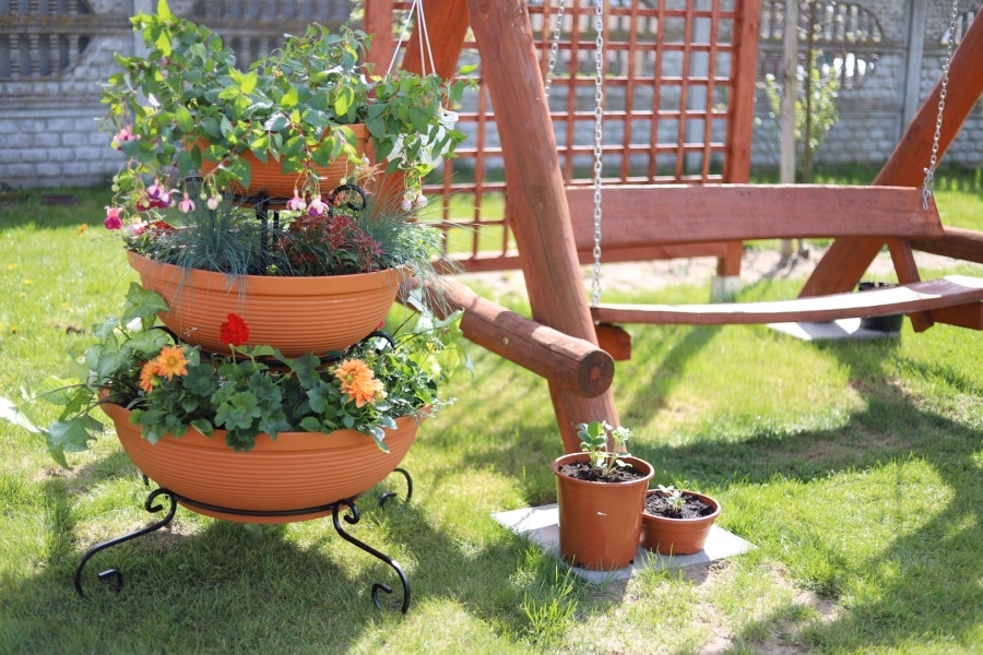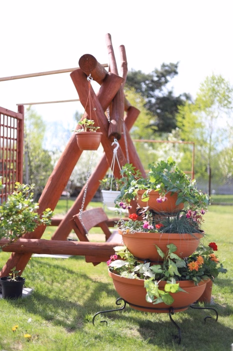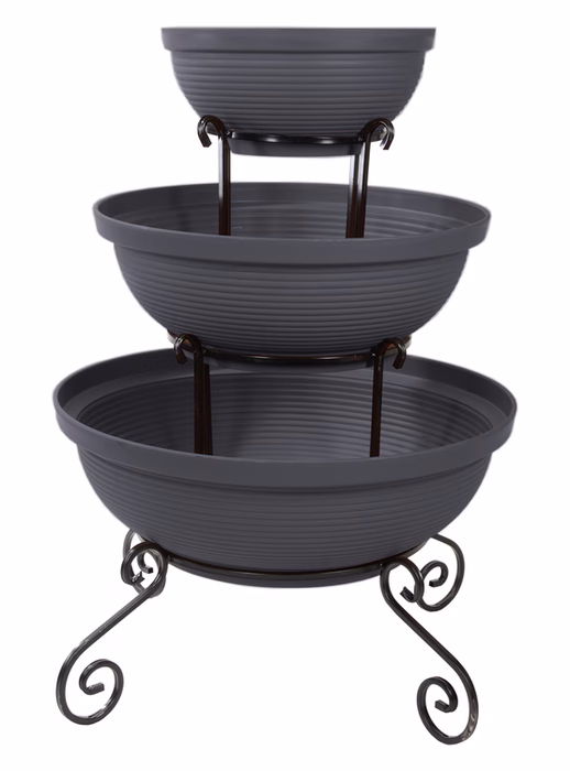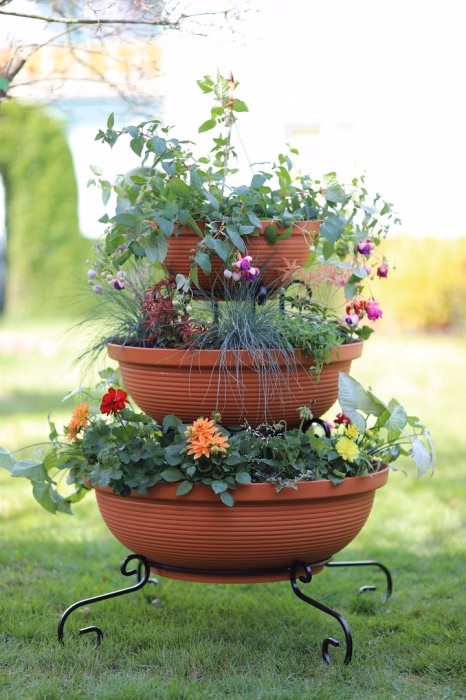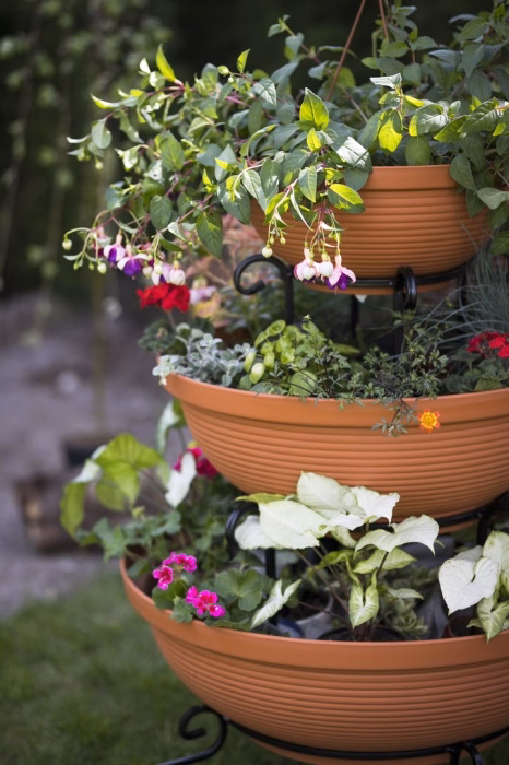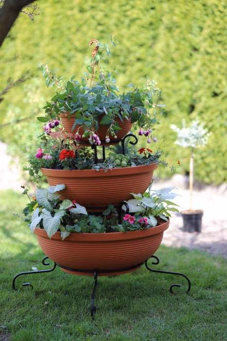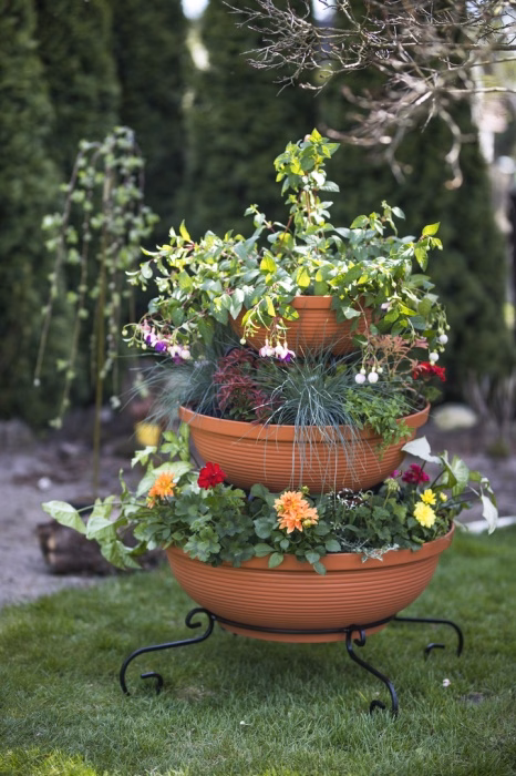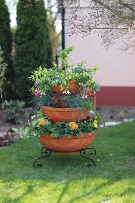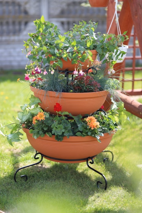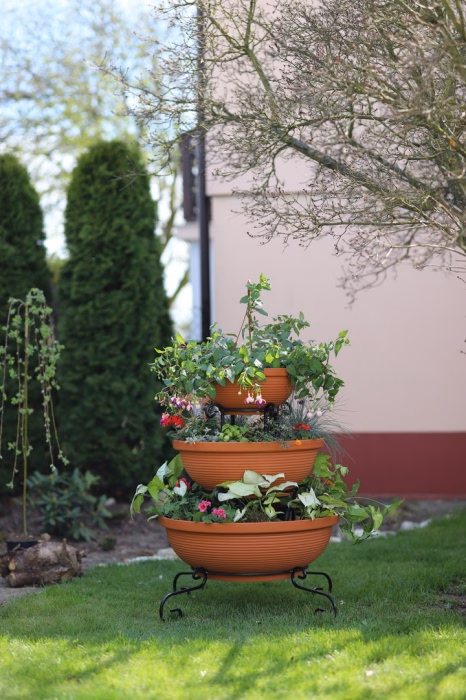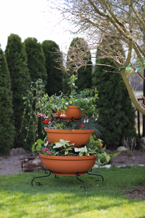 Ogród i balkon / Meble ogrodowe / Kwietniki ogrodowe - Kwietnik kolumna - ozdobny - 3 misy Marzysz o spektakularnym wyglądzie swojego ogrodu bądź tarasu? Wybierz nowoczesny kwietnik z oferty sklepu internetowego Versanis. Składa się z trzech donic w kolorze czarnym lub terakota, ustawionych na sobie od największego do najmniejszego na prostym stelażu, wykonanym ponadczasową techniką metaloplastyki. Stojak ten, podobnie jak inne kwietniki ogrodowe ze sklepu Versanis, jest stabilny, trwały i odporny na działanie deszczu czy na zarysowania. Jest niezwykle uniwersalny – będzie pasował do wielu innych elementów otoczenia. Sprzyja temu również możliwość wyboru koloru metalowej konstrukcji. Dla najlepszego efektu w donicach warto zasadzić rośliny wiszące, które pięknie, kaskadowo spływać będą z góry, ciesząc oko gości i domowników.