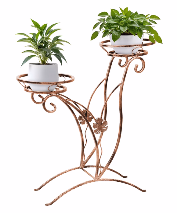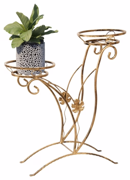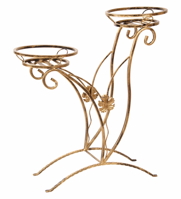 Dekoracje wnętrz / Kwietniki / Kwietniki duże - Kwietnik metalowy na dwie rośliny Wyjątkowej klasy polski kwietnik z metalu wykonany przez polskiego producenta zachwyci największych fanów klasycznego designu. Wytrzymały i odporny, charakteryzuje się przede wszystkim stabilnością – można go ustawić nawet na mniej równym gruncie w ogrodzie. Równie efektownie prezentował się będzie we wnętrzu holu albo w przestronnym pokoju dziennym. Odcień malowanej proszkowo konstrukcji można dopasować do pozostałych mebli i dodatków, wybierając pomiędzy jaśniejszymi lub ciemniejszymi wariantami. Kwietnik ozdobiony jest eleganckimi, kutymi w stali motywami roślinnymi, które docenią miłośnicy ekskluzywnego wzornictwa. Posiada trzy praktyczne podstawy, które pomieszczą nawet całkiem duże donice na rośliny.