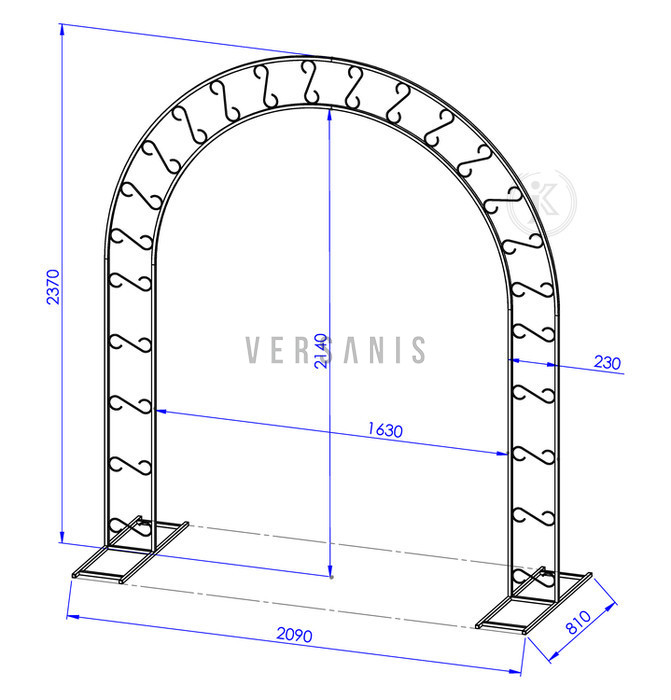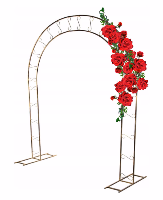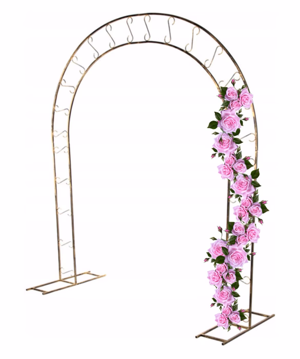 Ogród i balkon / Podpory do roślin - Metalowa brama ogrodowa/weselny łuk Stylowa brama z metalu pomoże Ci stworzyć nastrój jak z „Tajemniczego ogrodu”. Może stanowić podporę dla pnących roślin, na przykład róż, samodzielną dekorację albo część większej kompozycji. Metalowy łuk przyda się również w roli dekoracji na przyjęciach weselnych w ogrodzie, można dodatkowo ozdobić ją chociażby satynowymi szarfami czy wieńcami z ciętych kwiatów. Brama ogrodowa składa się z podwójnego rzędu stalowych łuków udekorowanych subtelnymi, wykonanymi techniką metaloplastyki falkami. Szeroka podstawa zapewni całej konstrukcji odpowiednią stabilność i pozwoli ustawić bramę ogrodową na dowolnym gruncie, a jednocześnie jest dyskretna. Malowany proszkowo metal dobrze znosi niesprzyjające czynniki atmosferyczne. Postaw bramę na przykład na wejściu do ogrodu.