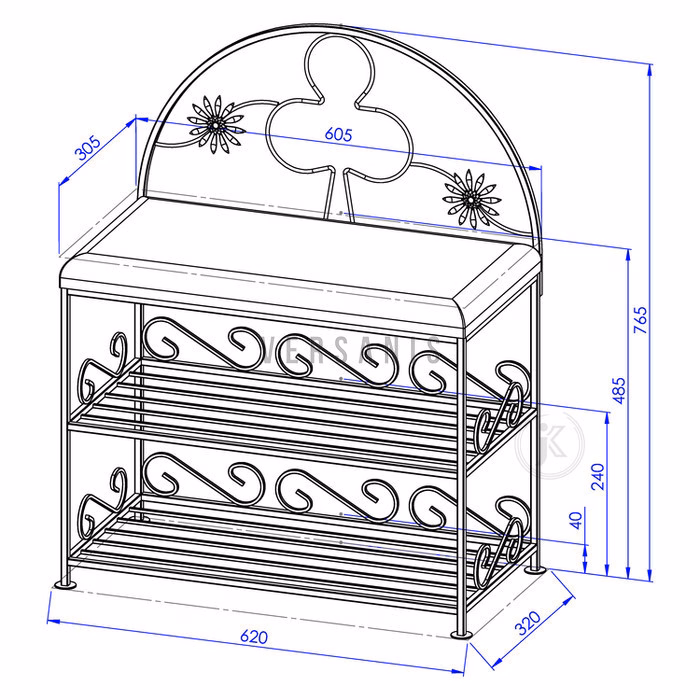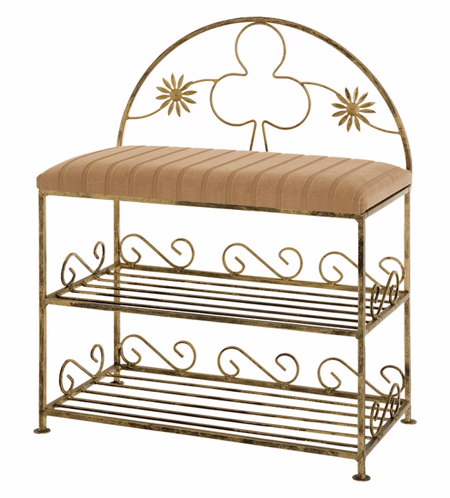 Meble / Sofy i ławki / Ławki na buty - Półka z oparciem Trefl z podwójną półką na buty Szafka na buty z siedziskiem i oparciem to praktyczne, a jednocześnie efektowne rozwiązanie, umożliwiające oszczędność przestrzeni i czasu. Nie zajmuje wiele miejsca, więc można je ustawić także w wąskich korytarzach i niewielkich przedpokojach. Stabilna konstrukcja z malowanego proszkowo metalu ozdobiona została giętymi formami z motywem karcianego trefla, dodającymi meblowi subtelności i szyku. Z kolei miękkie siedzisko, obite tkaniną w jednym z kilku, zgodnych z trendami wariantów kolorystycznych do wyboru, zapewnia użytkownikom komfort. Dwie dodatkowe półki z wytrzymałego drutu przydadzą się do przechowywania butów oraz akcesoriów. Półka z oparciem i siedziskiem z oferty sklepu internetowego Versanis pasuje zarówno do klasycznych, jak i nowoczesnych aranżacji.