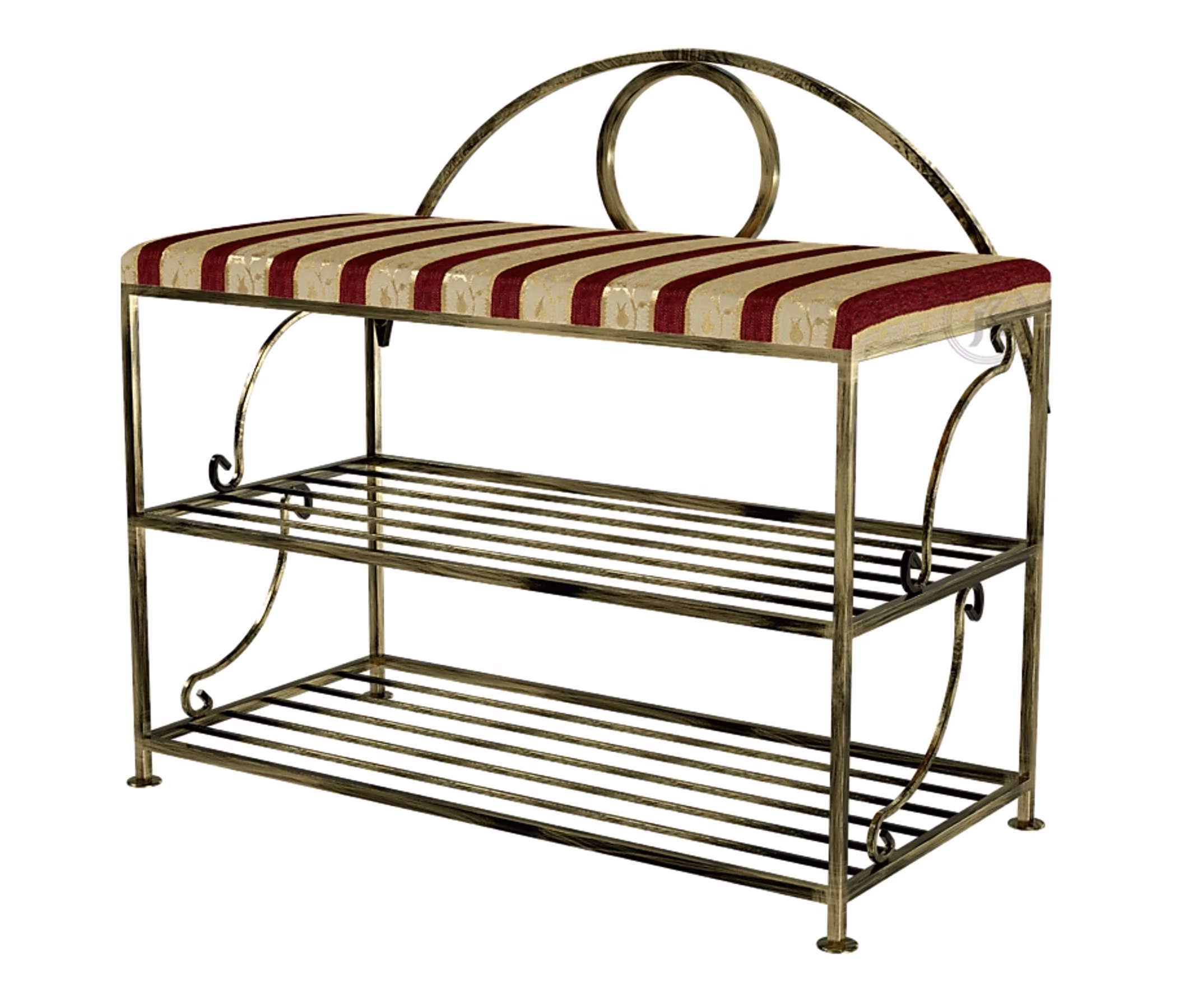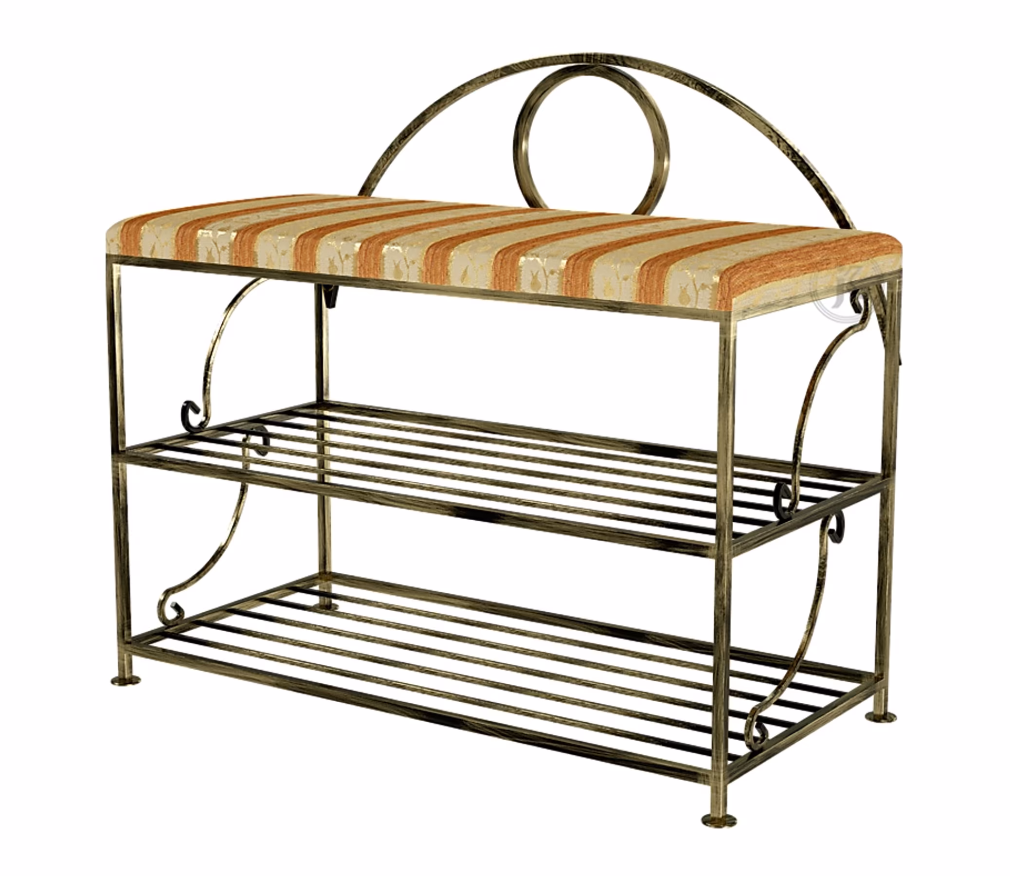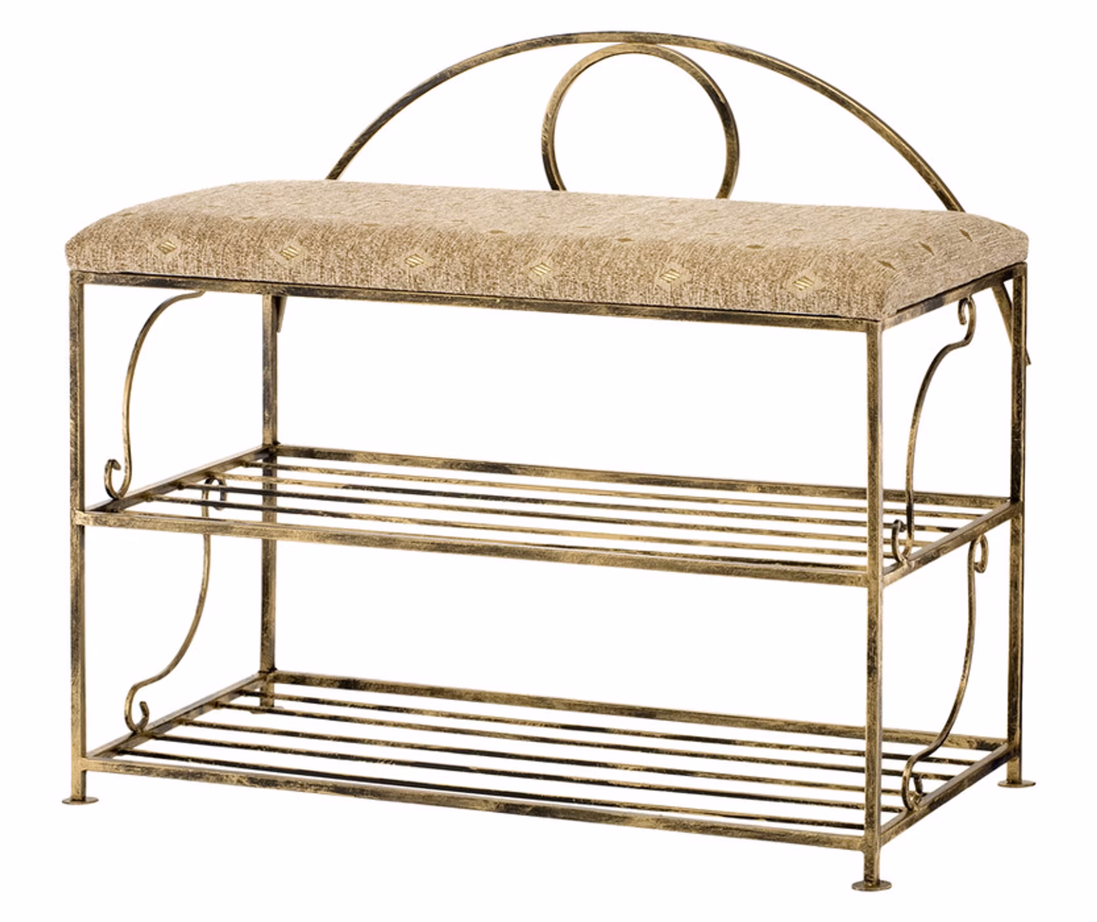 Meble / Sofy i ławki / Ławki na buty - Pufa z podwójną półką na buty Tapicerowana pufa z oferty sklepu internetowego Versanis.pl to wysokiej jakości polski produkt, który przyda się w korytarzu, wiatrołapie, łazience czy jadalni – czy to jako podnóżek, czy jako podręczne siedzisko służące do wkładania butów. Stabilny stelaż z z malowanego proszkowo metalu, ozdobiony secesyjnymi, giętymi elementami połączony został z miękkim siedziskiem, obitym tkaniną w kilku wariantach kolorystycznych do wyboru. Praktyczne, podwójne półki można wykorzystać do przechowywania ręczników, butów czy innych akcesoriów. Elegancka, stylizowana pufa może uzupełniać wnętrze w romantycznym lub kolonialnym stylu albo stanowić interesujący akcent w nowoczesnej przestrzeni. To dobre rozwiązanie, jeśli potrzebujesz równowagi między luksusowym stylem a funkcjonalnością.