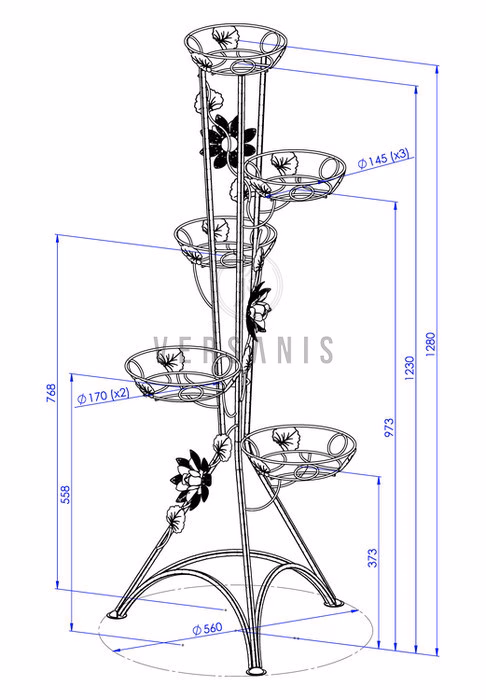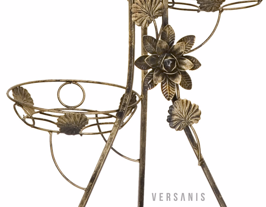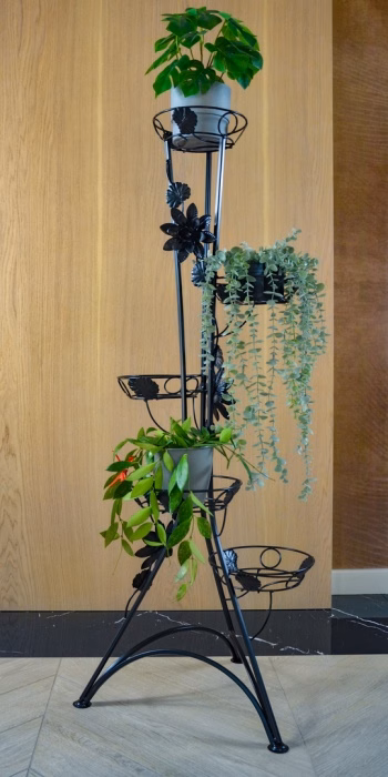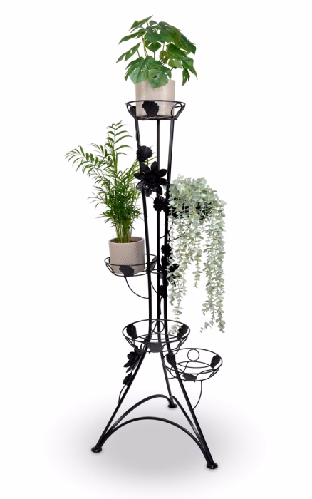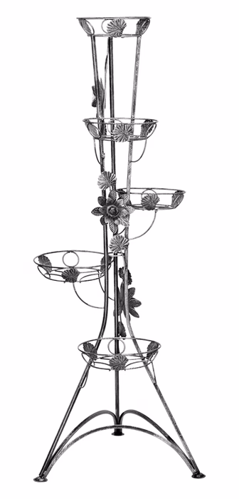 Dekoracje wnętrz / Kwietniki / Kwietniki duże - Stalowy kwietnik z motywem róży 5-ka Wysoki stojak na donice ze sklepu internetowego Versanis to akcent, który zamieni Twój balkon bądź taras w scenerię rodem z książki „Zaczarowany ogród”. Ten kwietnik metalowy wykonany został przez polskiego producenta ponadczasową, elegancką metodą metaloplastyki. Ozdobiony romantycznymi motywami kutych w stali róż, liści i subtelnych fal, zachwyci największych estetów spośród Twoich gości i domowników. Wysoki stojak składa się z aż pięciu pojemnych podstawek na donice. Jest stabilny, trwały i odporny. Dla najlepszego efektu w donicach warto zasadzić rośliny wiszące, na przykład róże, ale równie dobrze wyglądać będą na przykład paprocie. W celu lepszego dopasowania kwietnika do otoczenia, można wybrać jeden z kilku wariantów kolorystycznych.