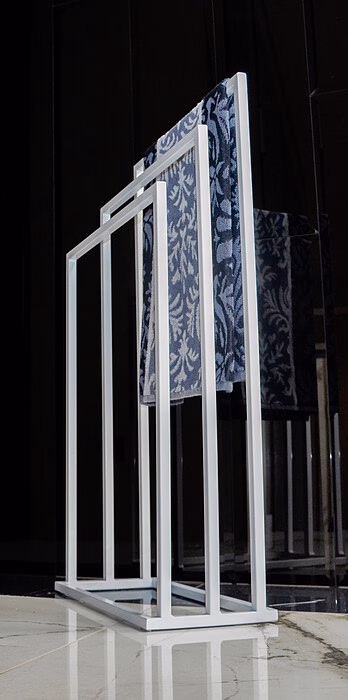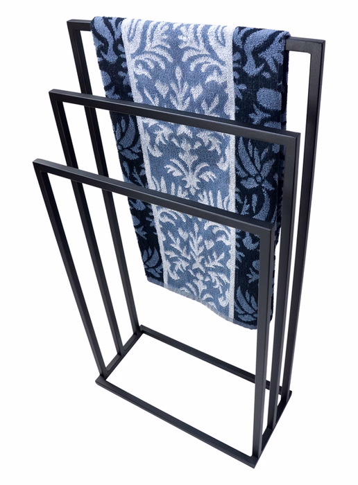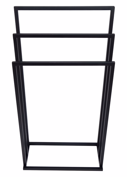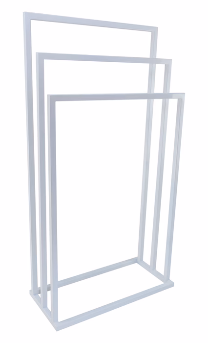 Pomieszczenia / Łazienka / Stojaki na ręczniki - Stojak na ręczniki. Wieszak łazienkowy 3 ramienny Prezentujemy piękny metalowy stojak na ręczniki dostępny w czterech wariantach kolorystycznych. Został w całości wykonany z metalu i zabezpieczony powłoką lakierniczą utwardzaną w wysokiej temperaturze, co zapewnia odpowiednie zabezpieczenia produktu przed wilgocią oraz wycieraniem koloru. Uniwersalność i prostota Dzięki mocnej i prostej konstrukcji stojak wkomponuje się w każdy styl wnętrzarski. Posiada on trzy pionowe ramiona. Każde z ramion został osadzony w odpowiednią odległość od siebie oraz posiada inną wysokość co pozwoli na odpowiednią cyrkulacją powietrza i szybsze suszenie ręczników. Ułatwia to również powieszenie ręczników o różnych długościach. Produkt nie wymaga samodzielnego montażu. Po wyjęciu z opakowania jest gotowy do użytku. Czyszczenie i konserwacja Zaleca się aby do czyszczenia nie używać detergentów. Do prawidłowego czyszczenia wystarczy ściereczka nawilżona wodą.