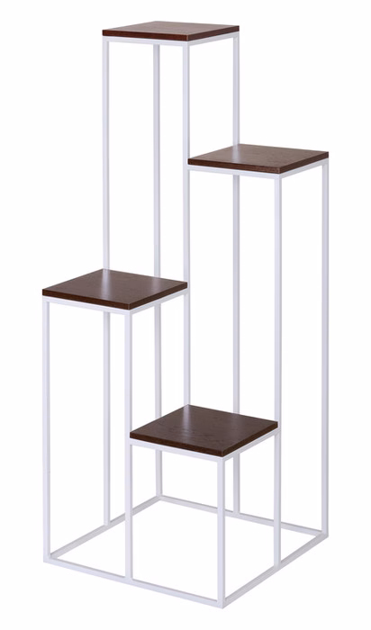 Dekoracje wnętrz / Kwietniki / Kwietniki duże - Stojak, kwietnik metalowy na 4 rośliny Stojak 4-ka jest wzbogaconą wersją stojaka uniwersalnego. Został wykonany z czterech zespolonych razem elementów tworzących solidną konstrukcję, będącą sama w sobie oryginalną dekoracją jak i przydatnym elementem do wystroju wnętrz. Stojak posiada metalową podstawę, oraz blat wykończony naturalną okleiną. Blaty są łatwe w utrzymaniu czystości. Są one mocną i trwałą podstawą nawet dla ciężkich przedmiotów. Stojak może posłużyć jako kwietnik będący idealnym miejscem do tworzenia oryginalnych kwiatowych kompozycji. Stojak oraz blaty są dostępne w kilku wariantach kolorystycznych przez co można je dopasować do wnętrz o różnych stylach.