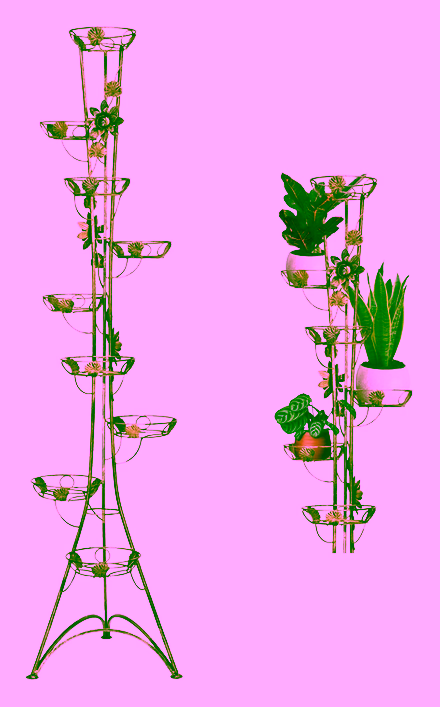Dekoracje wnętrz / Kwietniki / Kwietniki duże - Wysoki Kwietnik Kolumna 9-ka z różą Wysoki kwietnik kolumnowy z oferty sklepu internetowego Versanis to romantyczny dodatek, który stworzy na twoim tarasie atmosferę rodem z „Zaczarowanego ogrodu”. Ozdobiony romantycznymi motywami kutych w stali kwiatów, liści i subtelnych fal, wygląda niezwykle elegancko. Na ten wysoki stojak składa się aż dziewięć podstaw pod donice. Pomimo swojej wysokości jest ponadprzeciętnie stabilny i trwały. Dla najlepszego efektu w donicach warto zasadzić rośliny wiszące, które pięknie, kaskadowo spływać będą z góry, ciesząc oko gości i domowników. Żeby bardziej dopasować go do otoczenia, można wybrać jeden z kilku wariantów kolorystycznych.