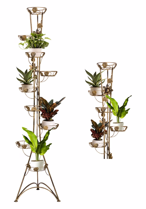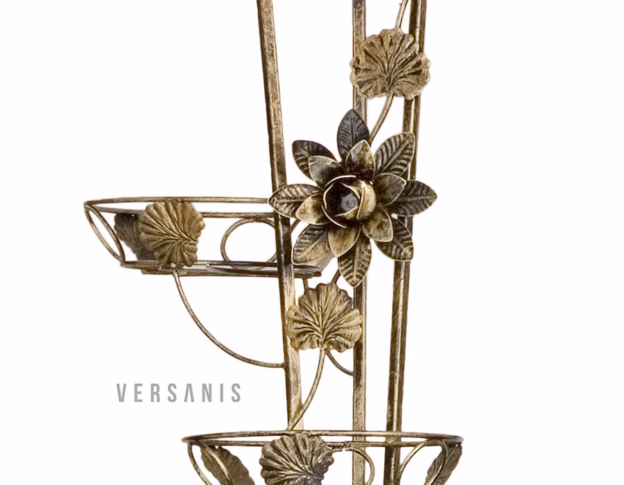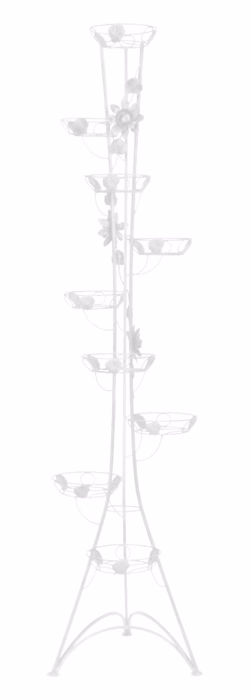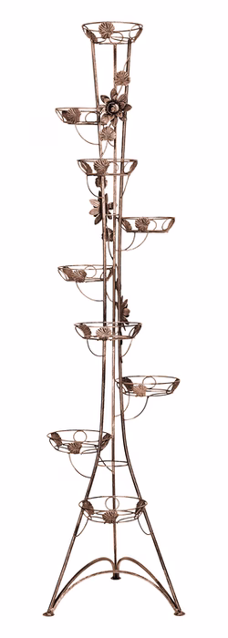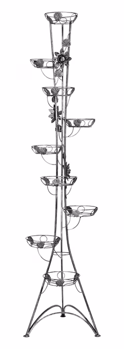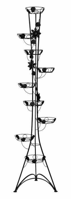 Dekoracje wnętrz / Kwietniki / Kwietniki duże - Wysoki Kwietnik Kolumna 9-ka z różą Wysoki kwietnik kolumnowy z oferty sklepu internetowego Versanis to romantyczny dodatek, który stworzy na twoim tarasie atmosferę rodem z „Zaczarowanego ogrodu”. Ozdobiony romantycznymi motywami kutych w stali kwiatów, liści i subtelnych fal, wygląda niezwykle elegancko. Na ten wysoki stojak składa się aż dziewięć podstaw pod donice. Pomimo swojej wysokości jest ponadprzeciętnie stabilny i trwały. Dla najlepszego efektu w donicach warto zasadzić rośliny wiszące, które pięknie, kaskadowo spływać będą z góry, ciesząc oko gości i domowników. Żeby bardziej dopasować go do otoczenia, można wybrać jeden z kilku wariantów kolorystycznych.