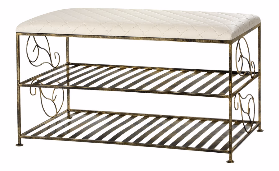 Meble / Sofy i ławki / Ławki na buty - Ławka na buty z dwiema półkami i siedziskiem Prezentowany produkt to stylowe rozwiązanie dwa w jednym, łączące ławkę do siedzenia z półką na buty. Doskonale sprawdzi się w każdym holu, korytarzu lub salonie. Sprawi, że wnętrze zyska tradycyjny i jednocześnie oryginalny charakter, rodem z pałacowych komnat. Będzie przepięknym elementem dekoracyjnym, reprezentującym od wejścia całe mieszkanie. Produkt, dzięki walorom estetycznym uznawany jest za luksusowy i ekstrawagancki. Poza wyjątkowym wyglądem, pufa jest także elementem praktycznym i funkcjonalnym. Stelaż wykonany z metalu, co gwarantuje niezawodną wytrzymałość. Produkt posiada tapicerowane siedzisko, osadzone na stelażu, umożliwiające wygodne zakładanie obuwia. Na dole znajdują się dwie półki, przeznaczone do przechowywania butów czy drobnych przedmiotów. Stelaż dodatkowo posiada przepiękne zdobienia dekoracyjne, dodające uroku i elegancji. Każdy korytarz czy hol wyposażony w ławkę na buty z podwójną półką zyska niepowtarzalny charakter, zwracający uwagę gości, a do tego niezwykle praktyczny.