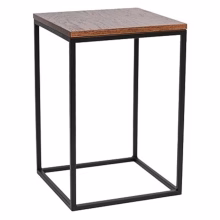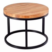 Nowoczesny stolik z grubym drewnianym blatem na solidnej, metalowej konstrukcji to...